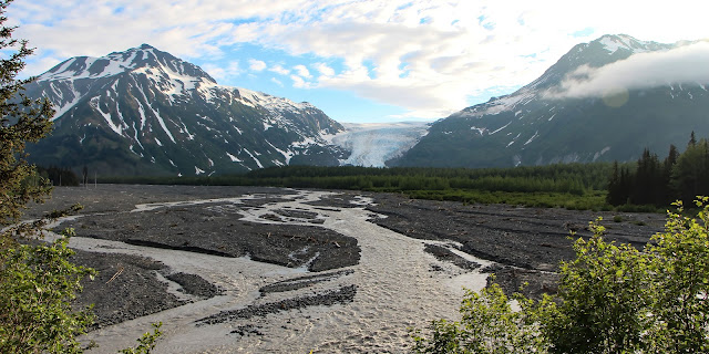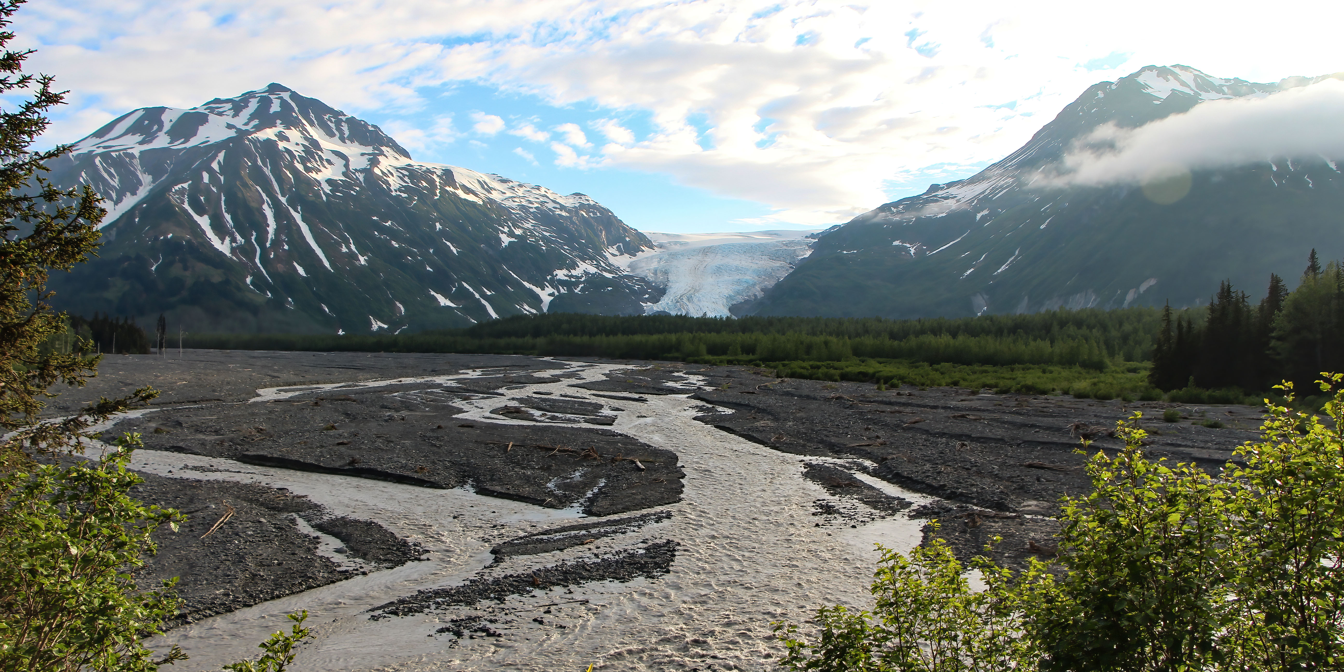 Alpine glaciers form in mountain basins, way up high. Exit Glacier, which forms a stream at its terminus, is an alpine glacier.