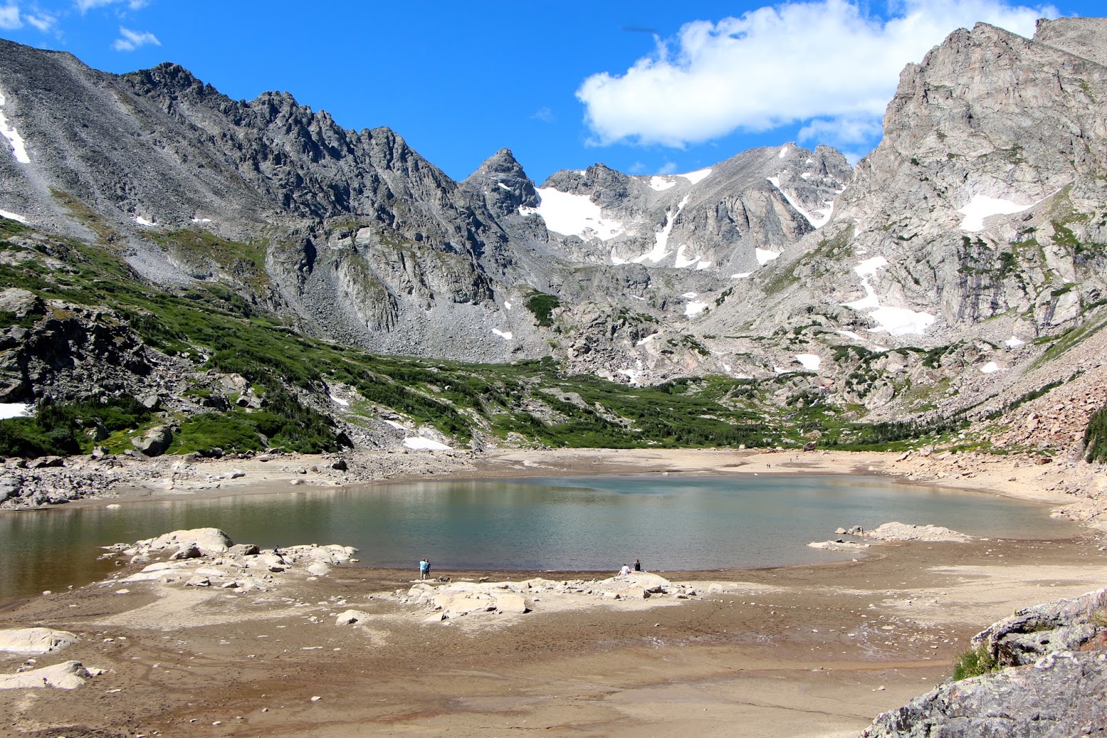 The lake itself is in a big glacier bowl. When Caty and I did the hike, the lake was very low although there was ample muddy evidence that it had recently been much higher.