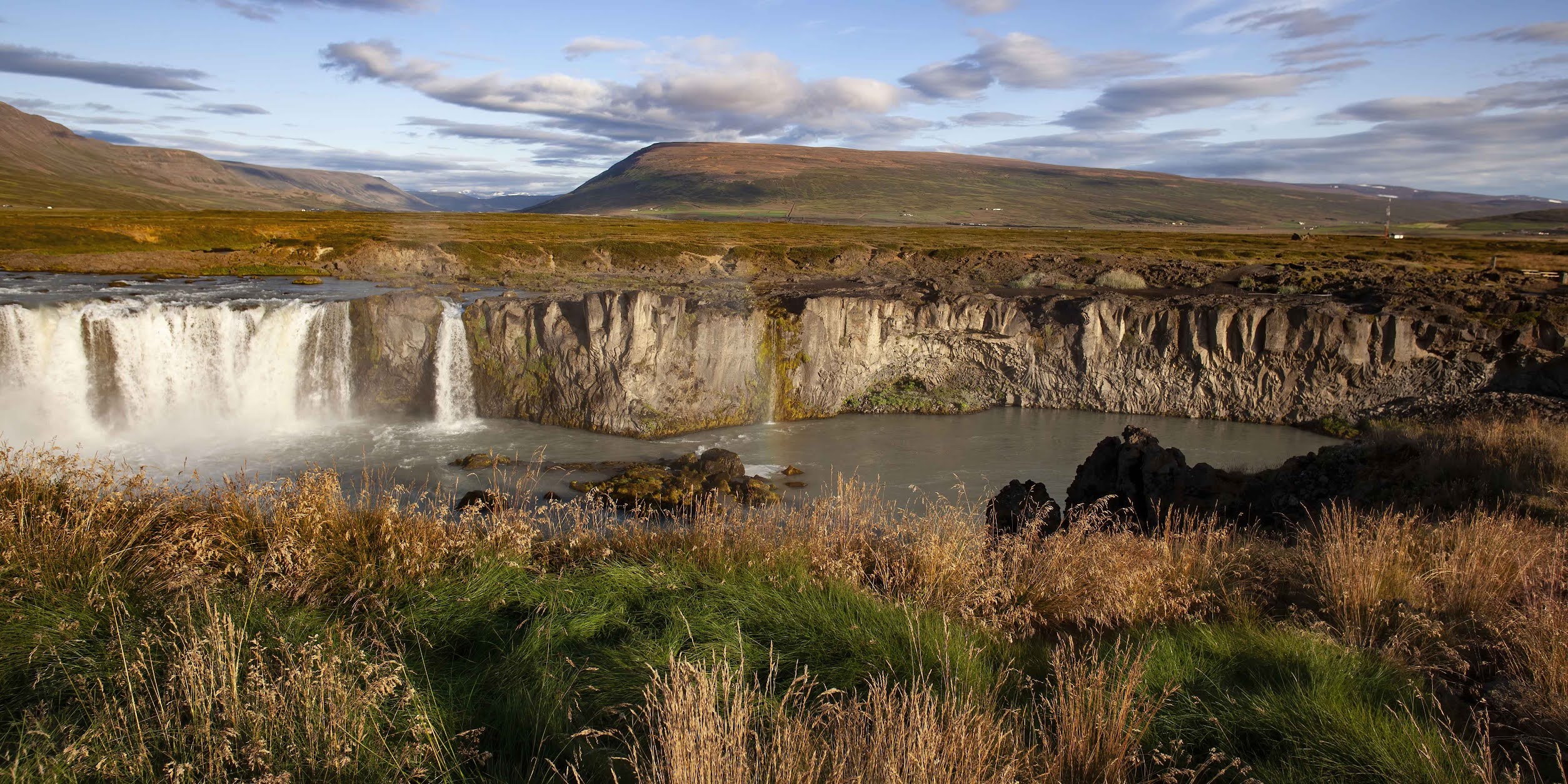 What makes Goðafoss so special is that the almost 100-foot-wide falls form an almost perfect semi-circle flanked by cliffs ...