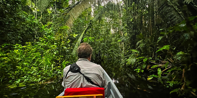 We traveled, almost silently, as fog wafted across the canal and little drops of rain occasionally dropped in the river. With the thick canopy, it can be difficult to tell if it is raining or not.